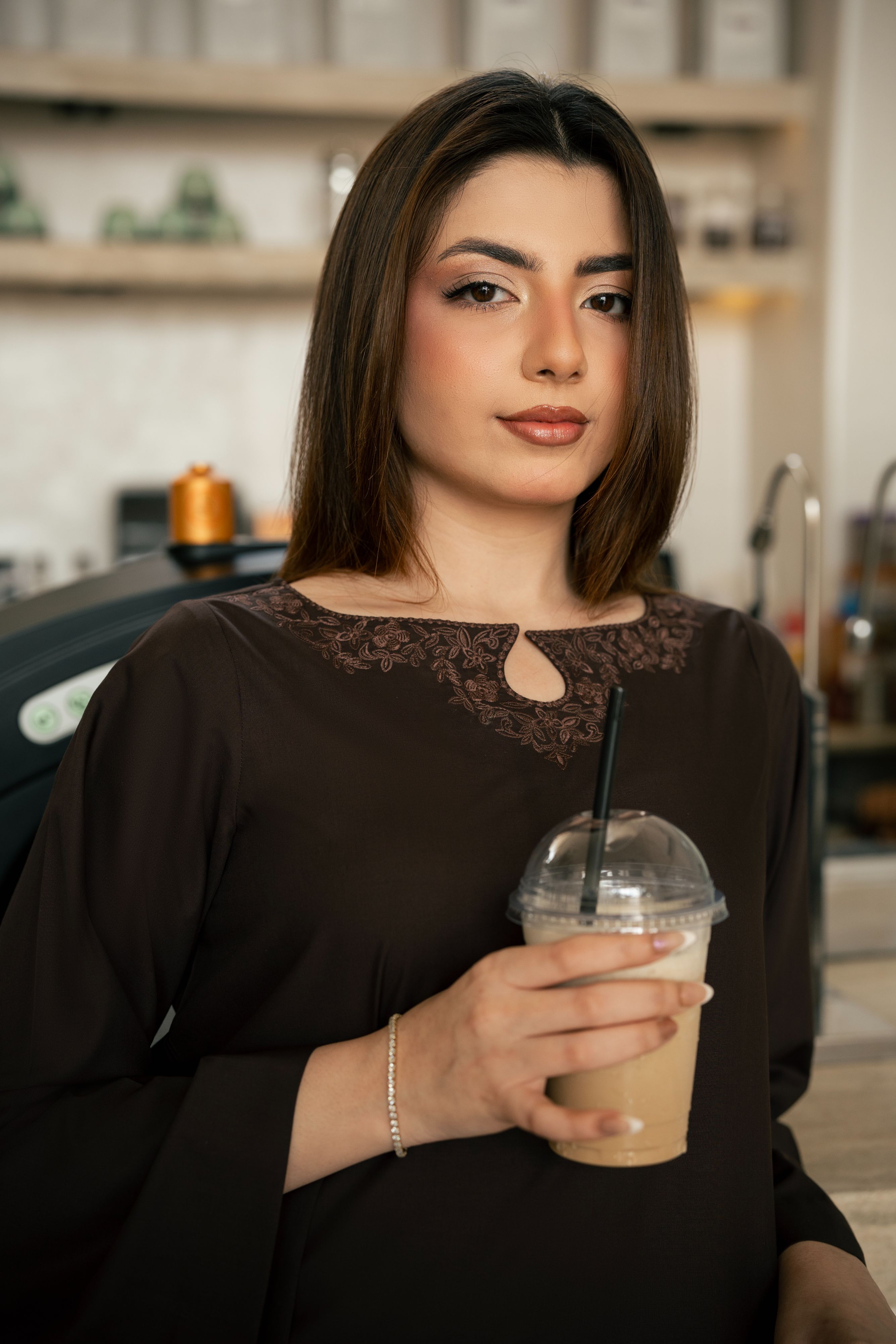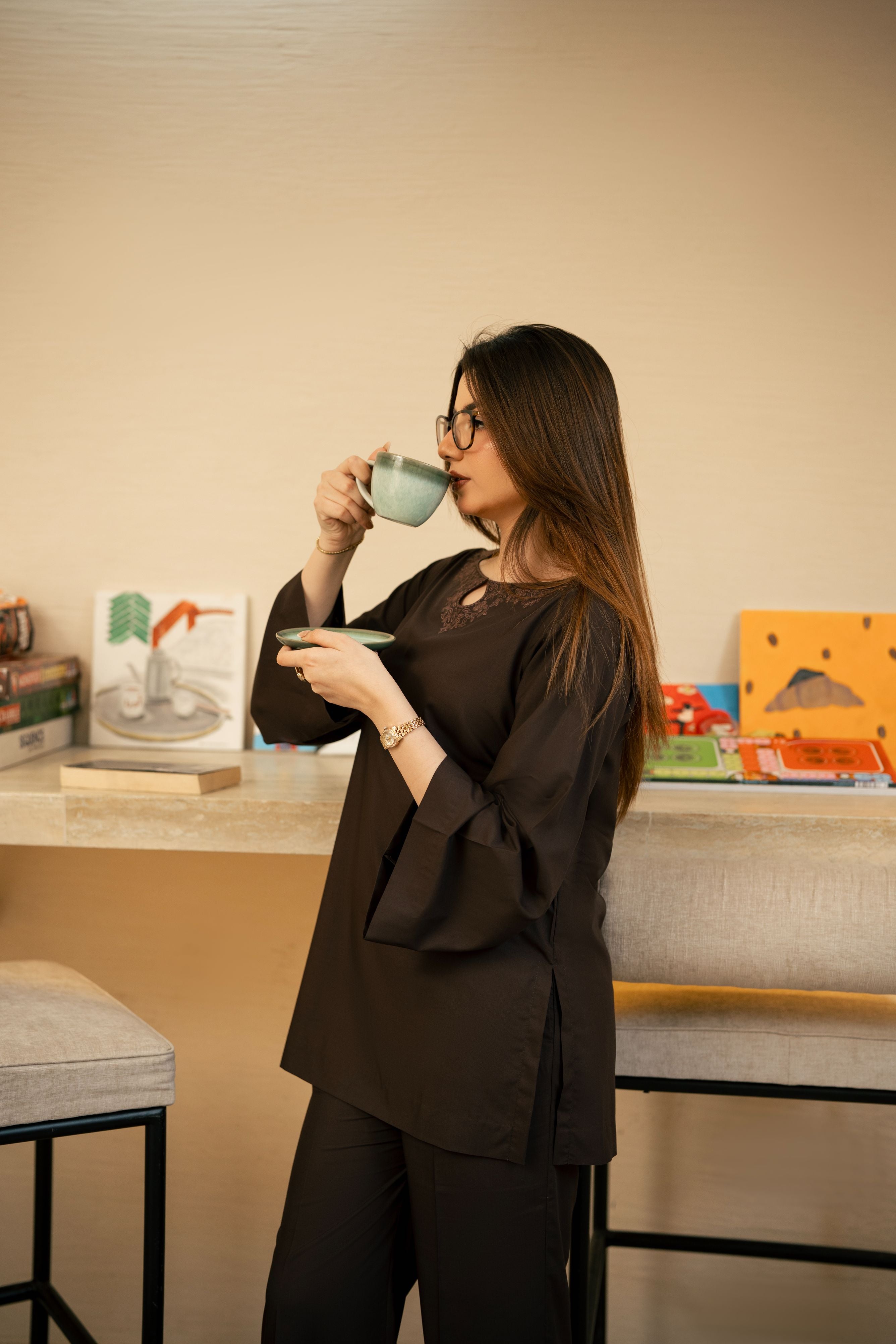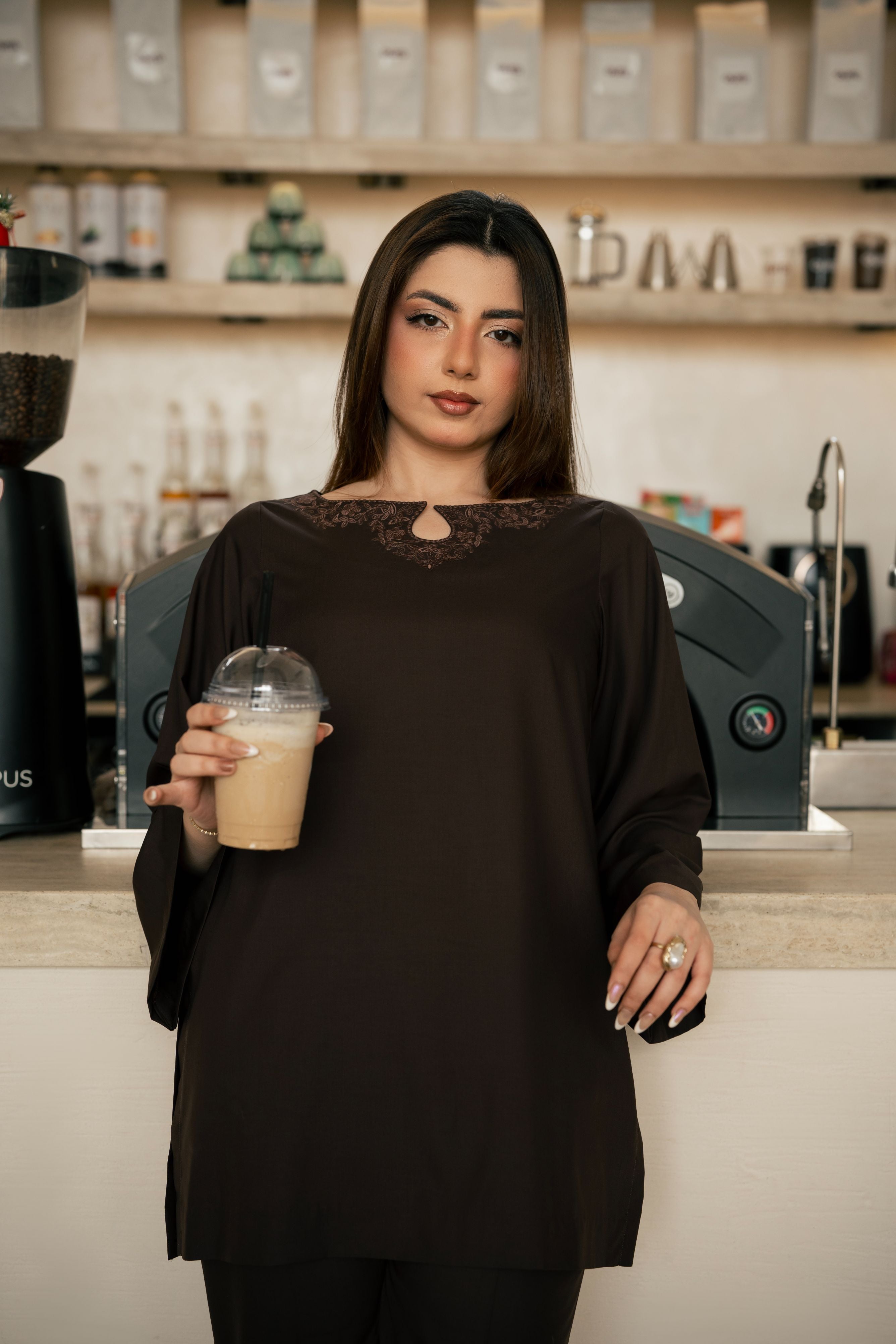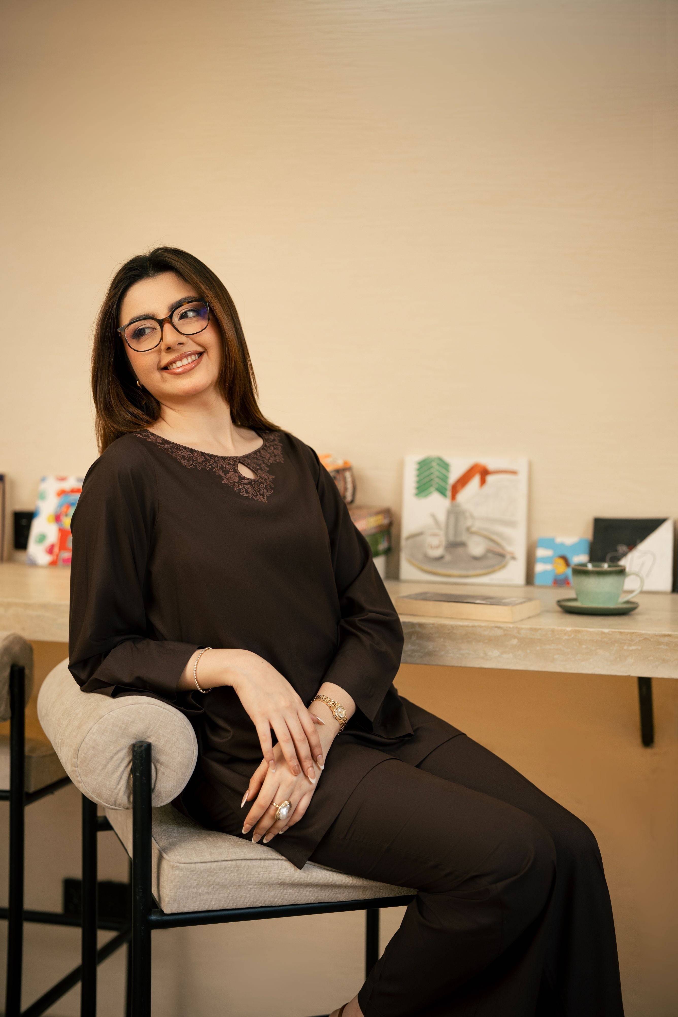 A deep brown co-ord set with a soft, classy feel with lace framed neckline that adds depth without calling attention to itself. Styled with bell-bottom trousers, this is the kind of outfit that speaks without saying much.